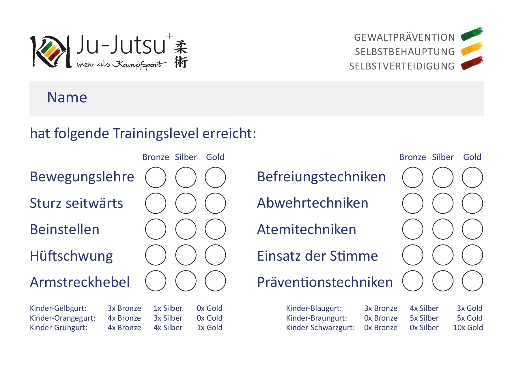 Jedes Kind erhält bei seiner Anmeldung eine eigene Trainingskarte mit zehn Ju-Jutsu-Disziplinen: